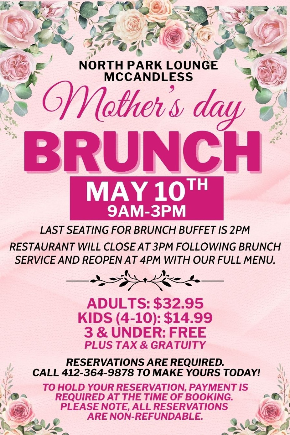 Mother’s Day Brunch at North Park Lounge McCandless May 10th | 9am to 3pm Last seating for brunch buffet at 2pm