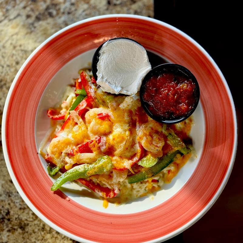 Grilled fajita seasoned shrimp with peppers and onions over cilantro lime rice. Topped with melted Colby Jack cheese. Served with a side of salsa, sour cream and your choice of salad or cup of soup.