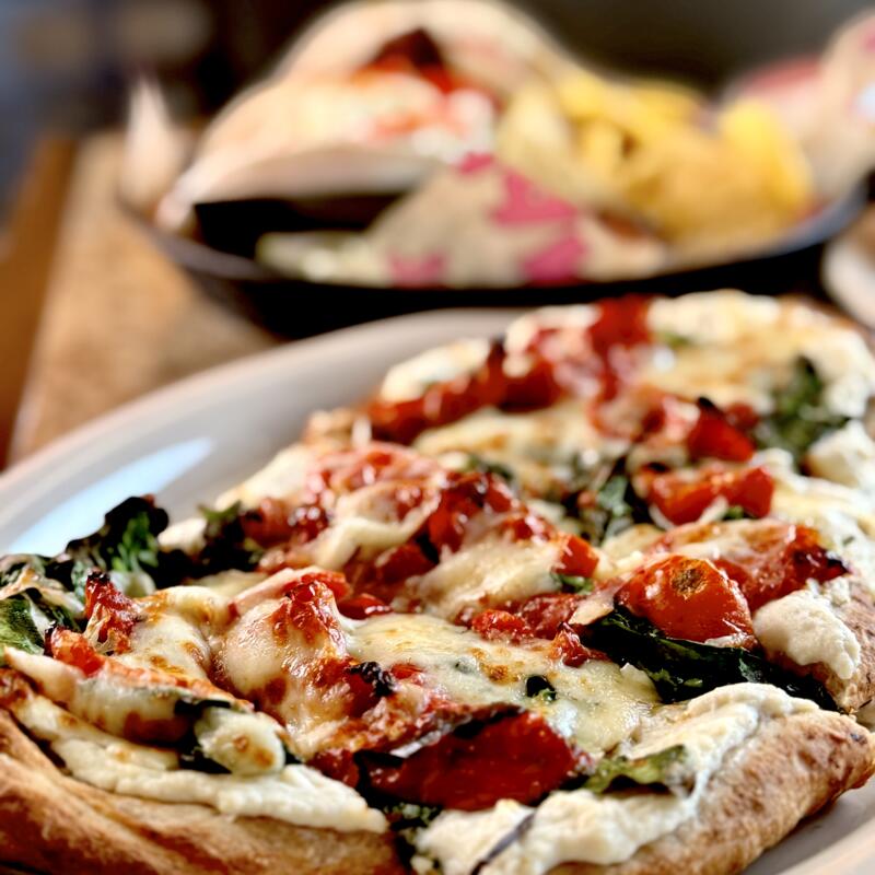 Grilled flatbread with ricotta, marinated tomatoes, spinach and mozzarella cheese.
