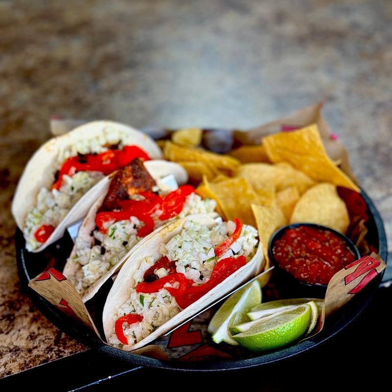 Three soft shell tacos filled with garlic lime slaw and roasted red peppers. Served with tortilla chips.